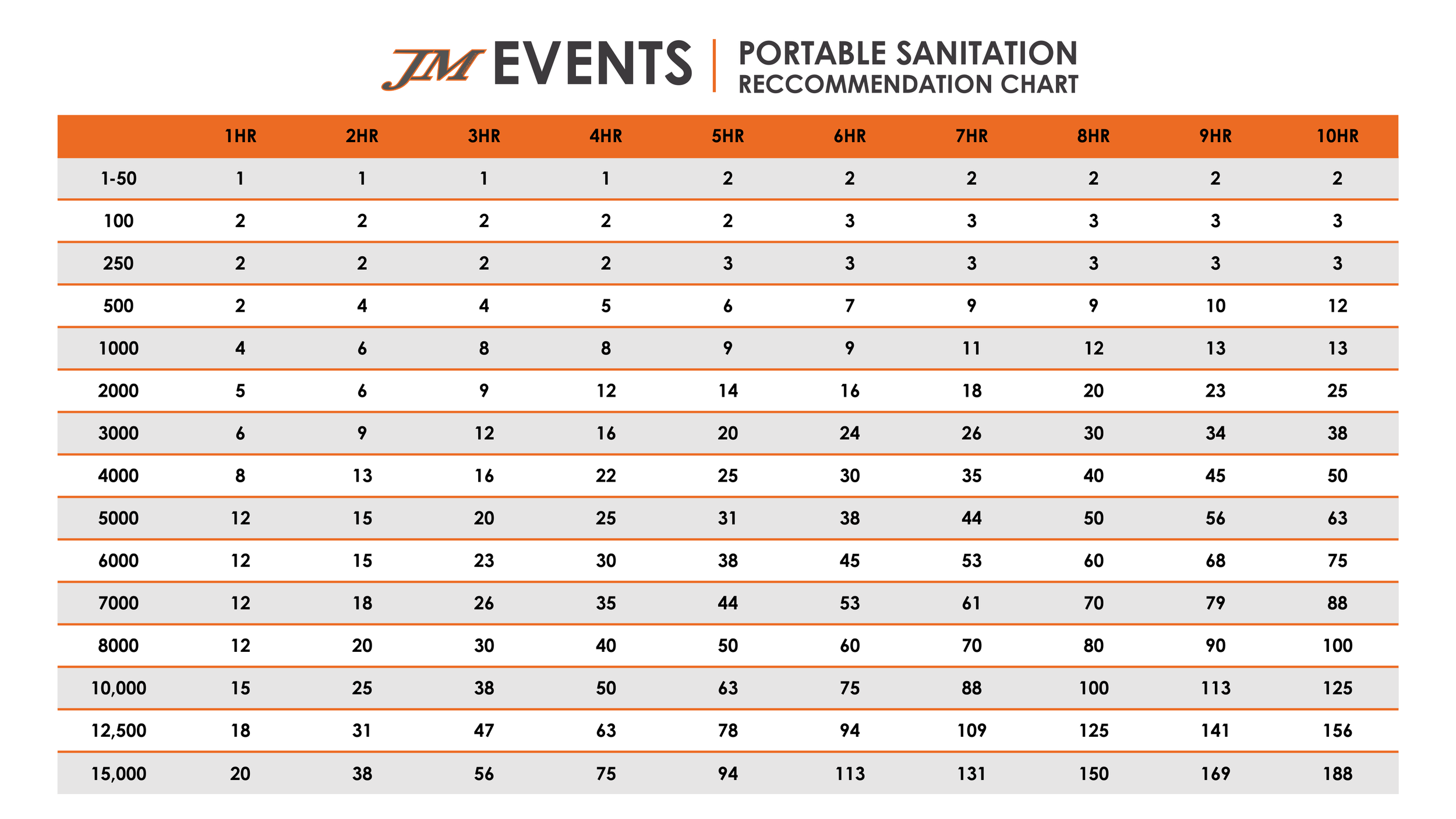 Please note that these are suggested guidelines—you’re always welcome to rent as many units as you feel necessary. If you’d like to order more than the recommended amount, let us know! This can help reduce the chance of lines forming at your event.